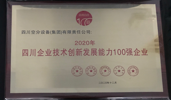 近日,我公司榮獲2020年“四川企業(yè)技術(shù)創(chuàng)新發(fā)展能力100強(qiáng)企業(yè)”榮譽(yù),這是客戶、行業(yè)和社會(huì)對(duì)我們的肯定,也是激勵(lì),更是責(zé)任!未來,四川空分集團(tuán)要繼續(xù)守初心,擔(dān)使命,大力推進(jìn)技術(shù)開發(fā)與自主創(chuàng)新,為把我國(guó)建成社會(huì)主義現(xiàn)代化強(qiáng)國(guó)作出川空新的更大的貢獻(xiàn)!