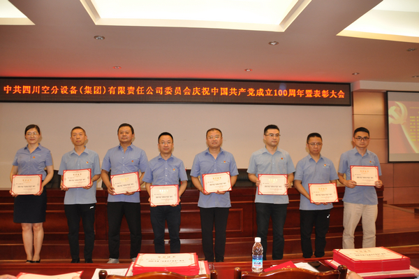 6月30日下午,(集團(tuán))公司技術(shù)樓三樓會議室隆重而熱烈,參會人員身著廠服,胸佩黨徽,笑意寫在每個(gè)人臉上,中共四川空分設(shè)備(集團(tuán))有限責(zé)任公司委員會慶祝中國共產(chǎn)黨成立100周年暨表彰大會在這里舉行。(集團(tuán))公司黨委委員前排就坐,黨委委員、副董事長單凱主持大會,100余名黨員代表及相關(guān)人員與會。
