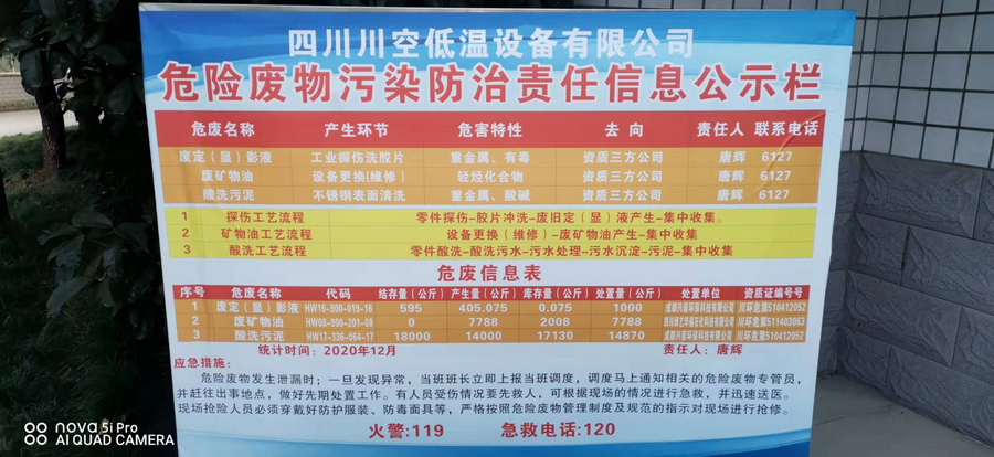 四川川空低溫設備有限公司——危險廢物污染防治責任信息公示欄