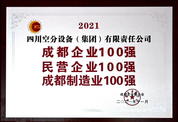 2021年11月,我公司再次被成都企業聯合會頒證授予“成都企業100強”、成都“民營企業100強”、“成都制造業100強”。這也是我公司連續多年獲得這些稱號。 為貫徹成都市培育大企業大集團發展戰略,成都企業聯合會連續多年參照全球企業500強的評選方式開展了成都百強的評審,我公司也連年入列。