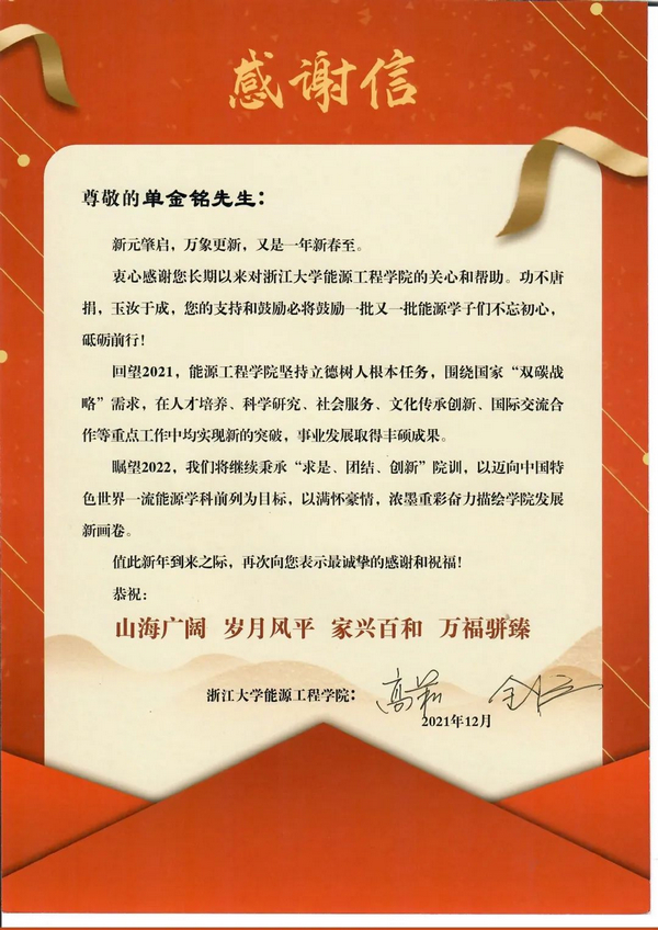 自2004年開始,“單金銘低溫獎(jiǎng)學(xué)金”已經(jīng)連續(xù)18年不間斷向華中科技大學(xué)、西安交通大學(xué)、浙江大學(xué)三所高校低溫專業(yè)的優(yōu)秀學(xué)子發(fā)放,至今發(fā)放金額累計(jì)已超過百萬。由于受疫情管控影響,單金銘董事長(zhǎng)未能親臨三所高?,F(xiàn)場(chǎng)發(fā)放2021年度的獎(jiǎng)學(xué)金,改由學(xué)校代為發(fā)放,浙江大學(xué)也由此給單金銘董事長(zhǎng)發(fā)來感謝信。