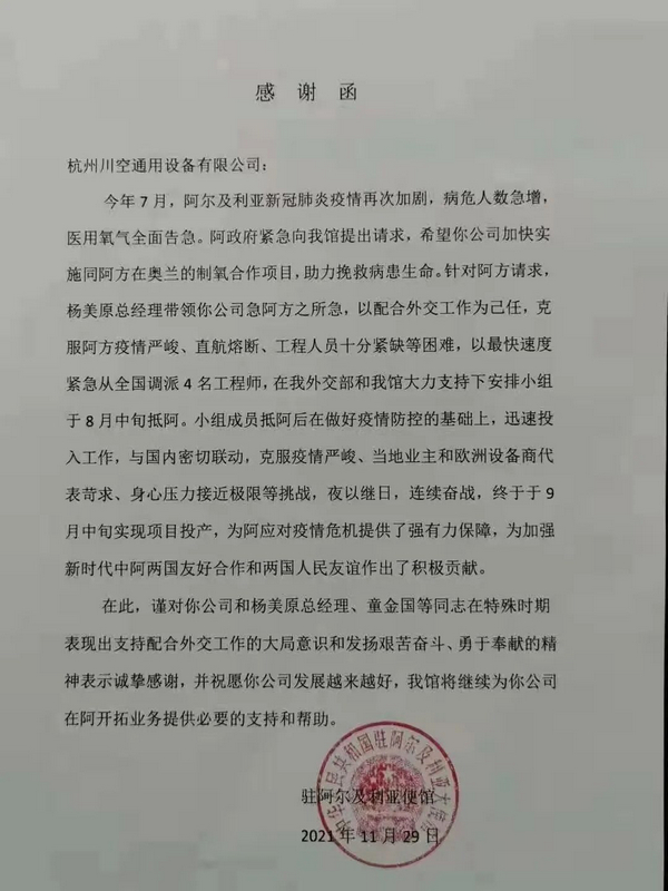 2021年11月29日,中國駐阿爾及利亞大使館給我公司杭州川空發來感謝信,對杭州川空在新冠疫情十分嚴峻的情況下,克服困難支持阿方推動液體空分的投產,助力挽救病患生命所作出的努力表示感謝,對杭州川空楊美原總經理以及童金國等同志在特殊時期支持和配合外交工作的大局意識和發揚艱苦奮斗、勇于奉獻的精神表示感謝。