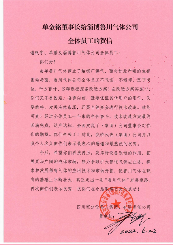 單金銘董事長給淄博魯川氣體公司 全體員工的賀信