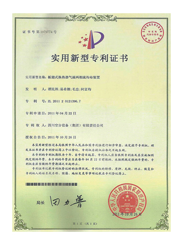 實用新型專利證書-板翅式換熱器氣液兩相流均布裝置