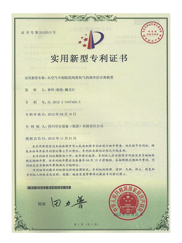 實用新型專利證書-從空氣中制取低純度氧氣的深冷法分離裝置