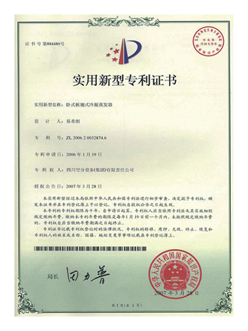 實用新型專利證書-臥式板翅式冷凝蒸發(fā)器