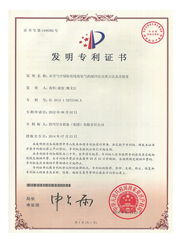 發(fā)明專利證書-一種空氣分離制取壓力氧氣的方法及裝置