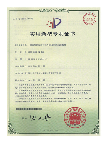 實用新型專利證書-一種富氧燃燒煙氣中的CO?提純及液化裝置