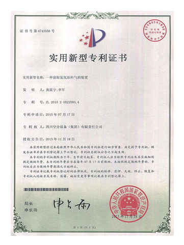 實用新型專利證書-帶制冷循環(huán)的低能耗制氮裝置