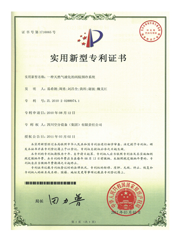 實用新型專利證書-一種天然氣液化的丙烷預(yù)冷系統(tǒng)